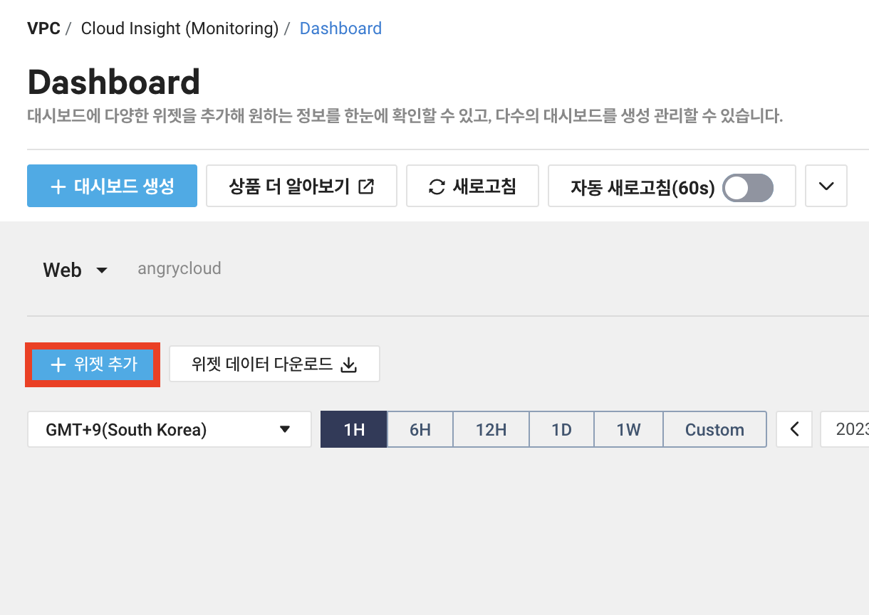 7. Dashboard가 생성되었지만 위젯이 하나도 없습니다. 위젯 추가를 클릭합니다.