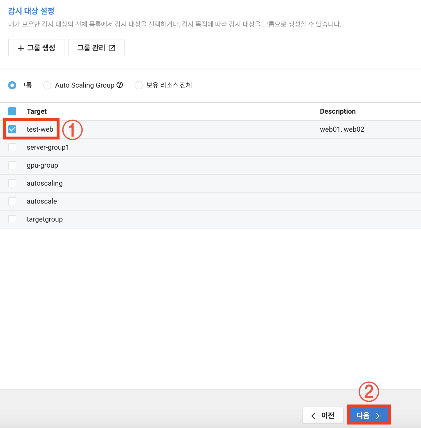 보유 리소스는 서버를 1개만 선택 가능하고 오토스케일링은 생성 안했으니 그룹을 생성하여 Web01과 Web02를 추가하겠습니다.
