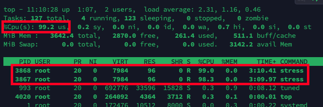 stress 명령어는 CPU, 메모리, 디스크 등 시스템 자원에 부하를 가하는 도구입니다.