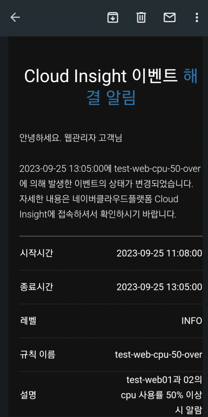 18. cpu 사용률이 떨어져 이벤트 종료 알람이 발생하는 것도 확인합니다.