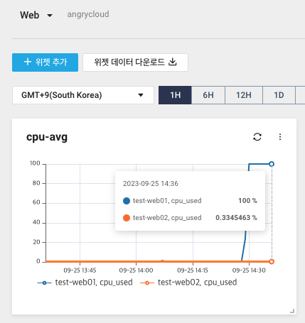 15. 이제 Web 대시보드에서 web01과 02 서버의 cpu 사용률 모니터링이 가능해졌습니다.