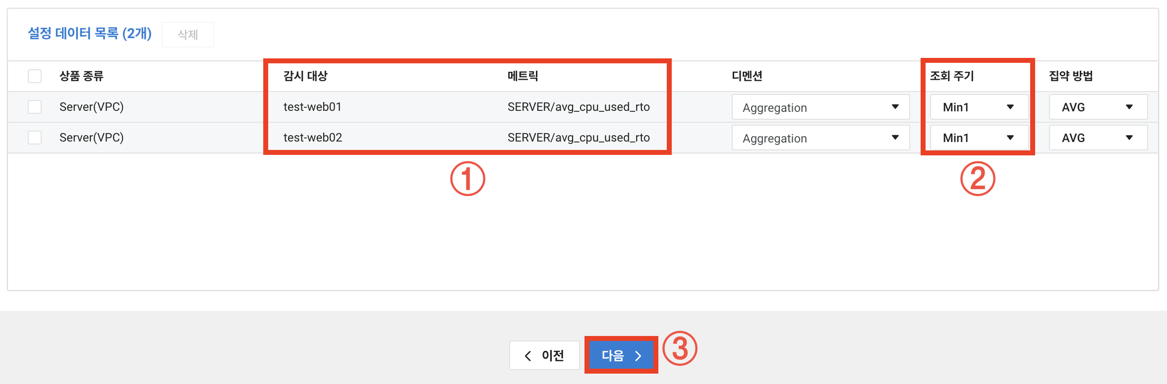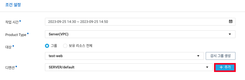 4. Server 대상이니 Product Type는 Server(VPC)를 선택하고 대상은 앞서 생성했던 test-web 그룹(web01,02) 선택. 디멘션은 Server/default를 선택 후 추가를 클릭합니다.