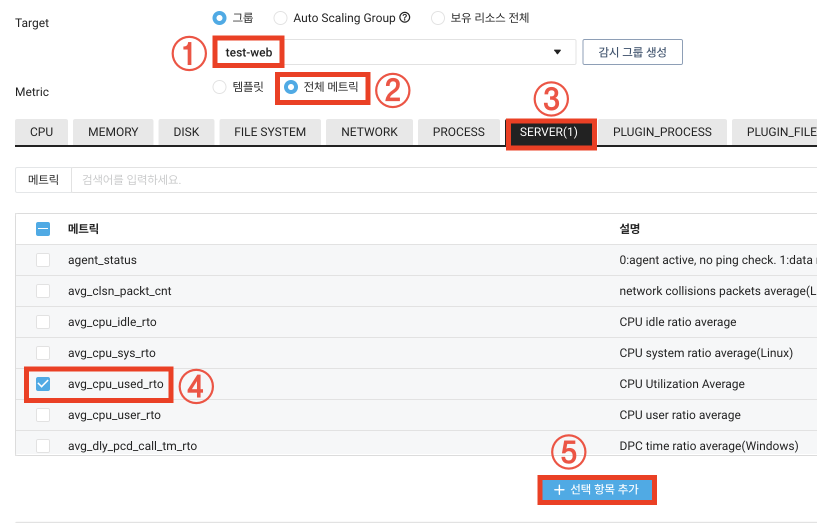 타겟 그룹 선택 -> 전체 메트릭 -> SERVER -> avg_cpu_user_rto -> 선택 항목 추가를 클릭합니다.
