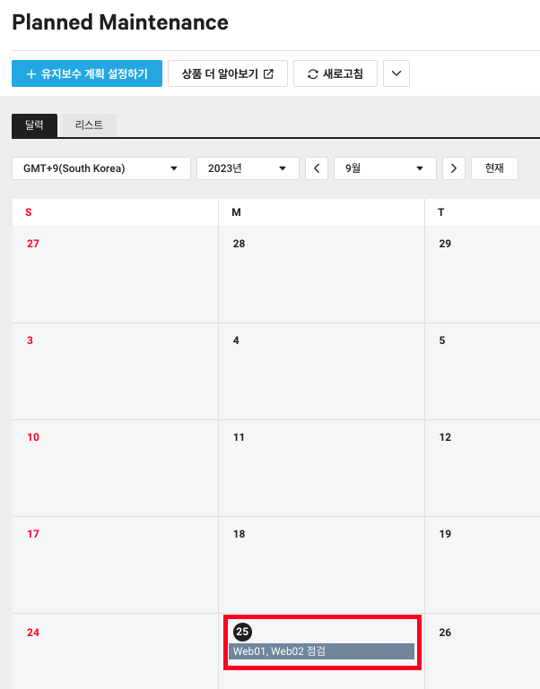 1. 왼쪽 Cloud Insight 메뉴에서 Planned Maintenance로 들어가면 달력이 보입니다.