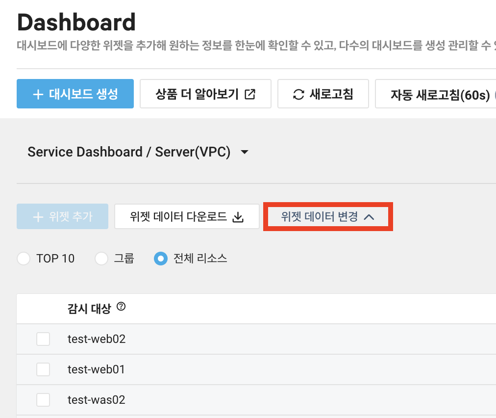 4. 기본 생성된 Dashboard에서도 위젯 데이터 변경을 통해 원하는 자원만 모니터링 할 수 있지만 여러 사용자들이 볼때마다 항목을 바꿔서 봐야하는 번거로움이 있습니다.