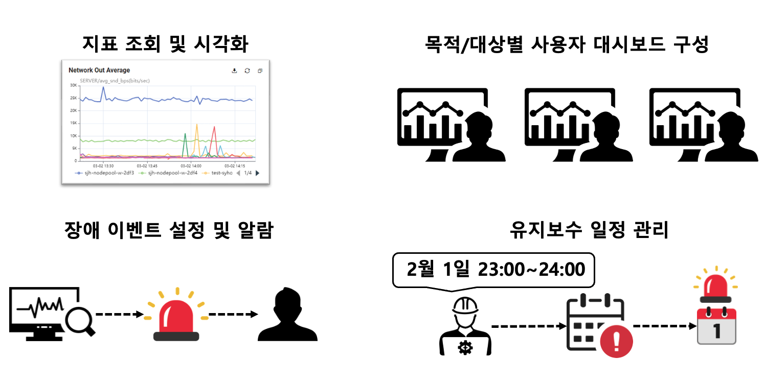 - 서비스들을 카테고리로만 대시보드에 분류하여 많은 사용자들이 확인할때 불편함이 있기 때문에 목적/대상별 사용자 대시보드를 따로 만들어 원하는 항목을 빠르게 확인할 수 있다.