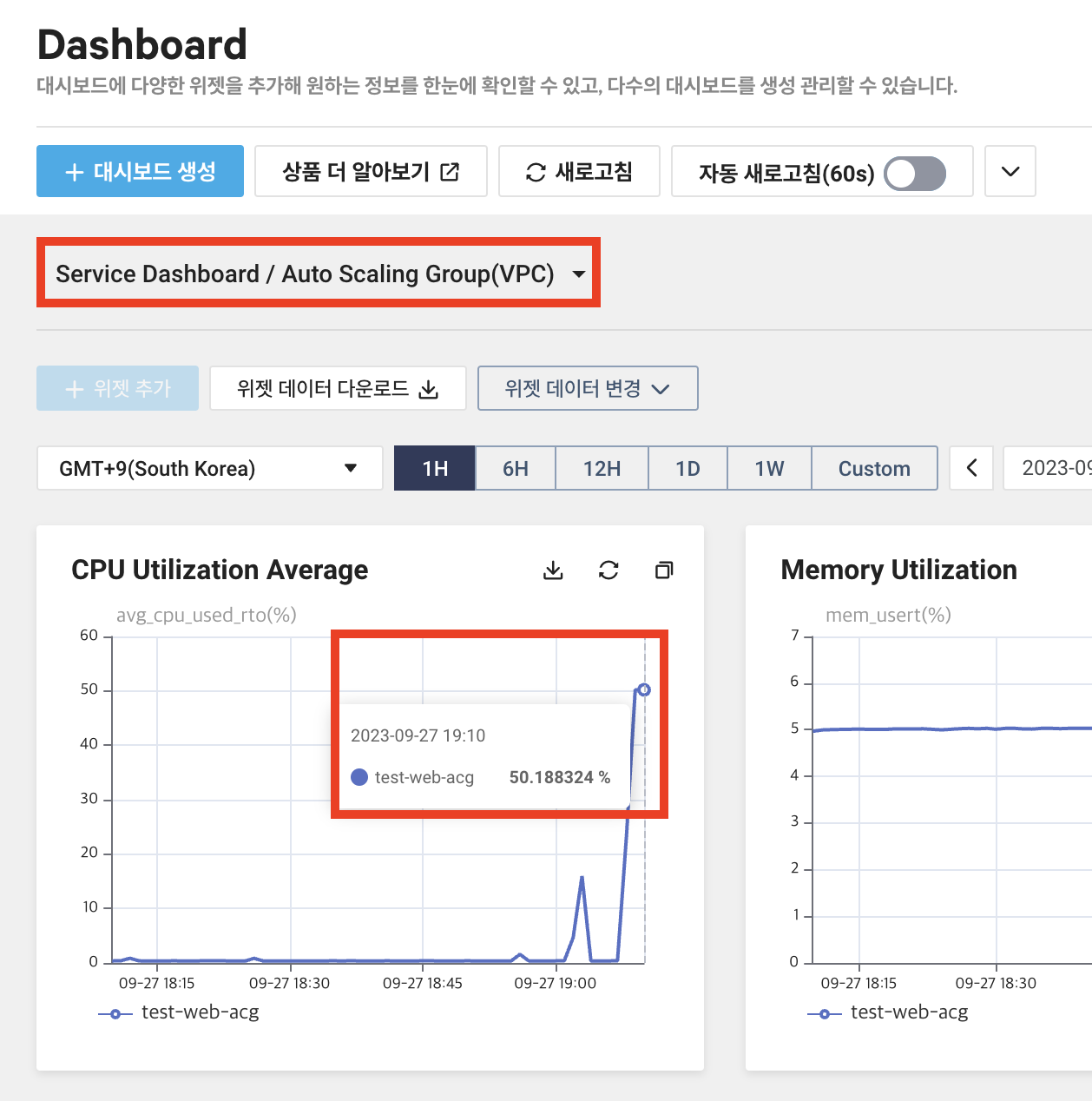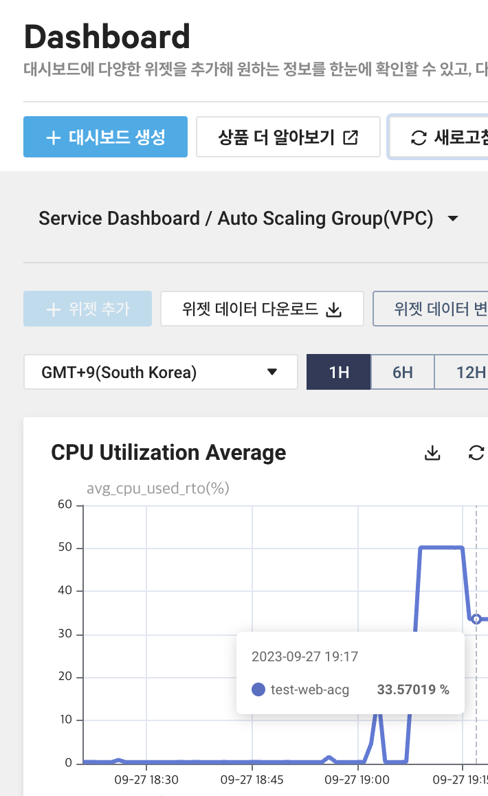 6. Auto Scaling Group(VPC) 대시보드를 확인해보면 CPU 사용률이 50%를 넘겼습니다.