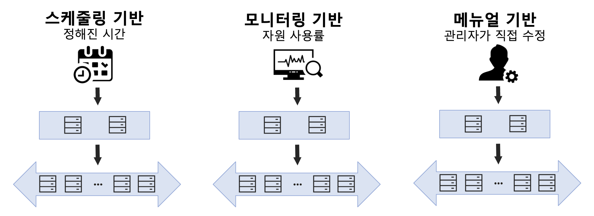 - 예시: 사용자가 애플리케이션에 대한 트래픽 예측을 기반으로 스케일 업 또는 스케일 다운 명령을 수동으로 실행하거나, 클라우드 서비스 제어판을 통해 리소스 크기를 수동으로 조정합니다.