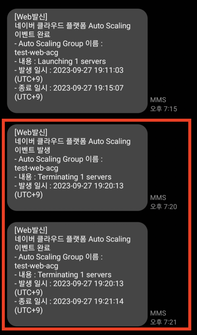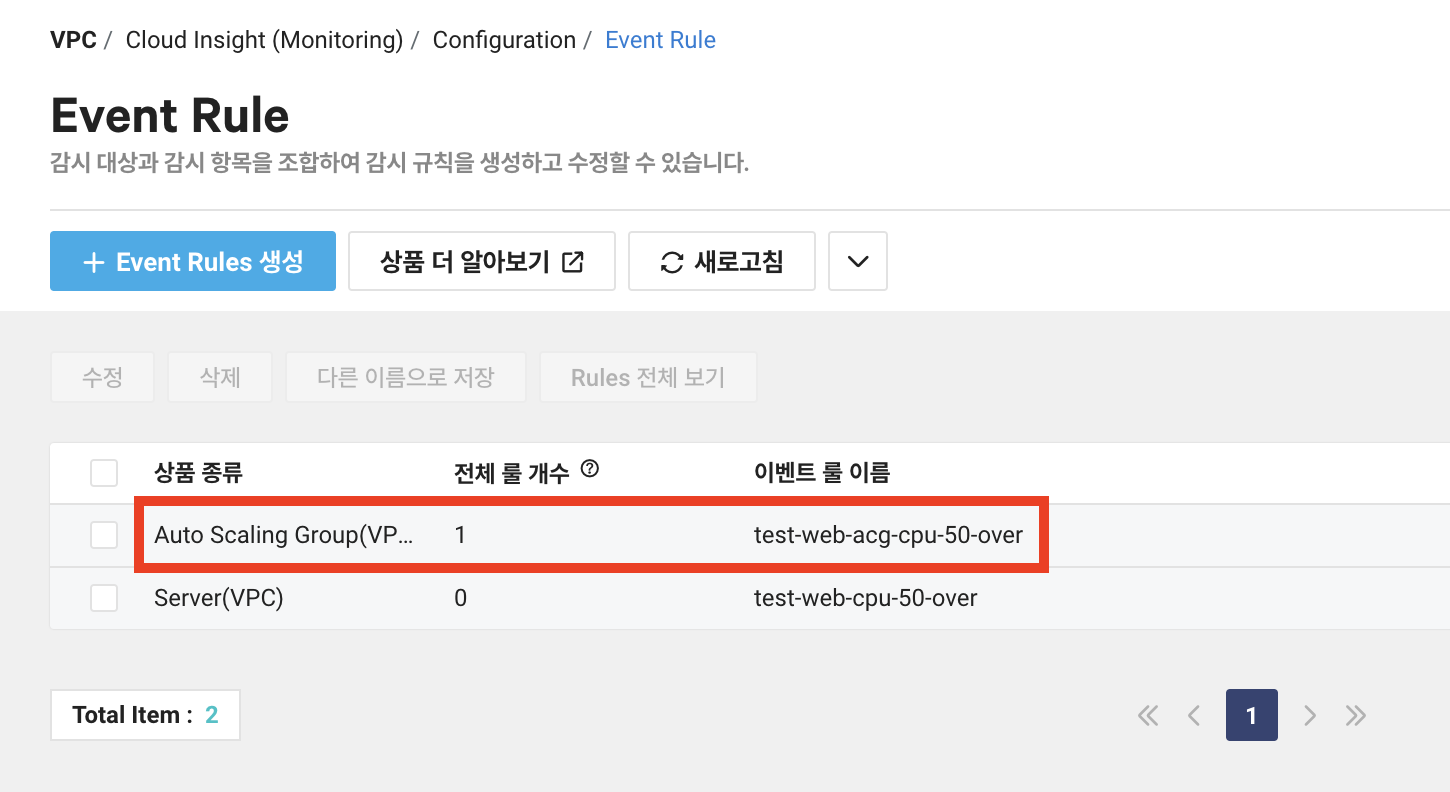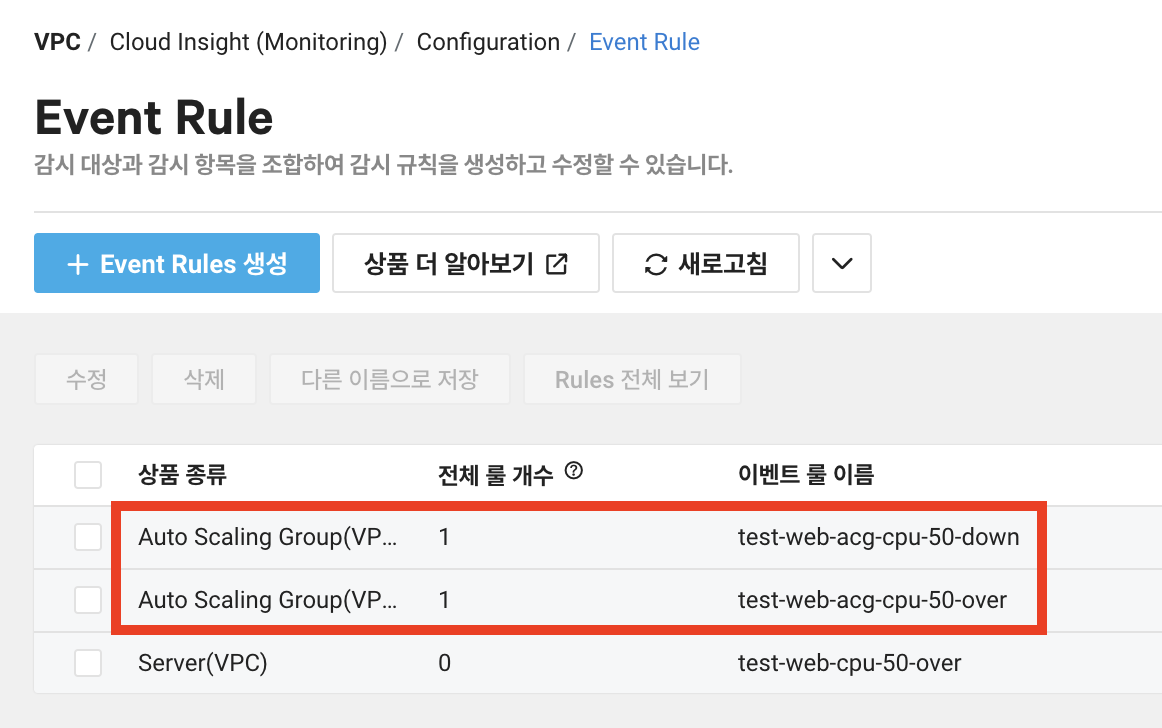 이제 CPU 사용률이 50%가 넘어간다면 Cloud Insight에서 이벤트를 감지하고 여기에 연동된 Auto Scaling Group의 정책이 실행되어 서버가 생성되게 됩니다.