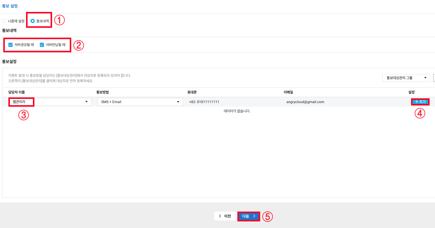 14. 이벤트 발생시의 통보 설정을 합니다.