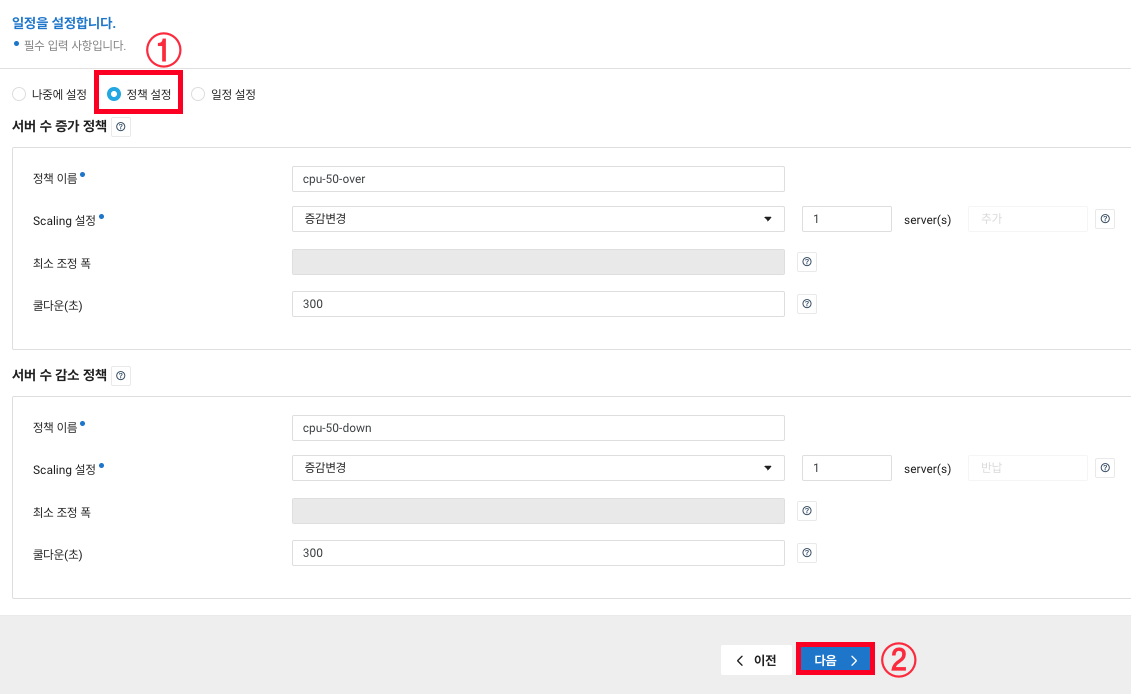 # 정책 설정은 특정 이벤트 발생 시 Auto Scaling을 수행하고, 일정 설정은 특정 시간대에 Auto Scaling을 수행합니다.