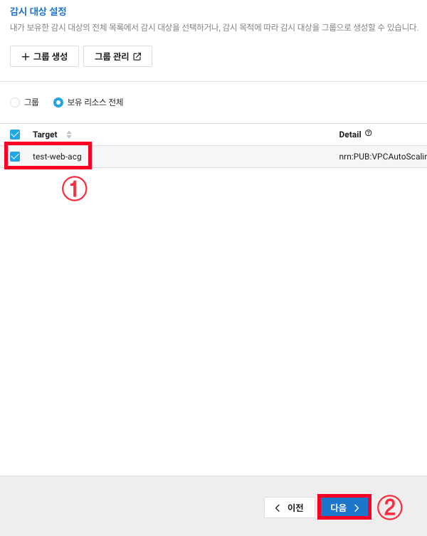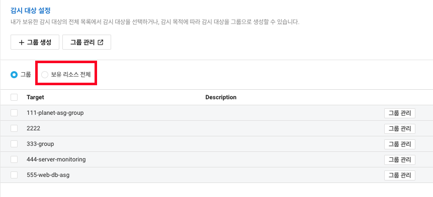 Auto Scaling Group 1개만 감시 대상에 넣을 것이기 때문에 감시대상 그룹을 만들지는 않고 보유 리소스 전체를 클릭하겠습니다.