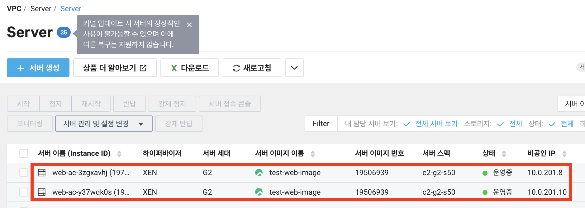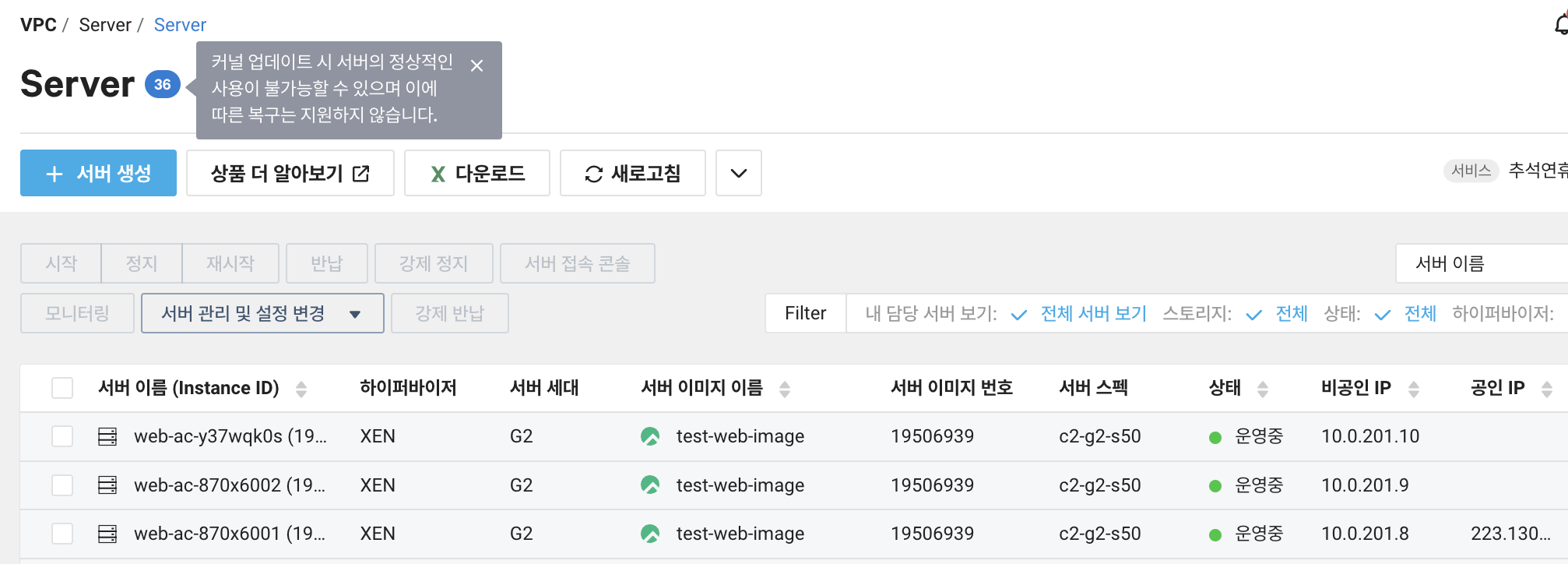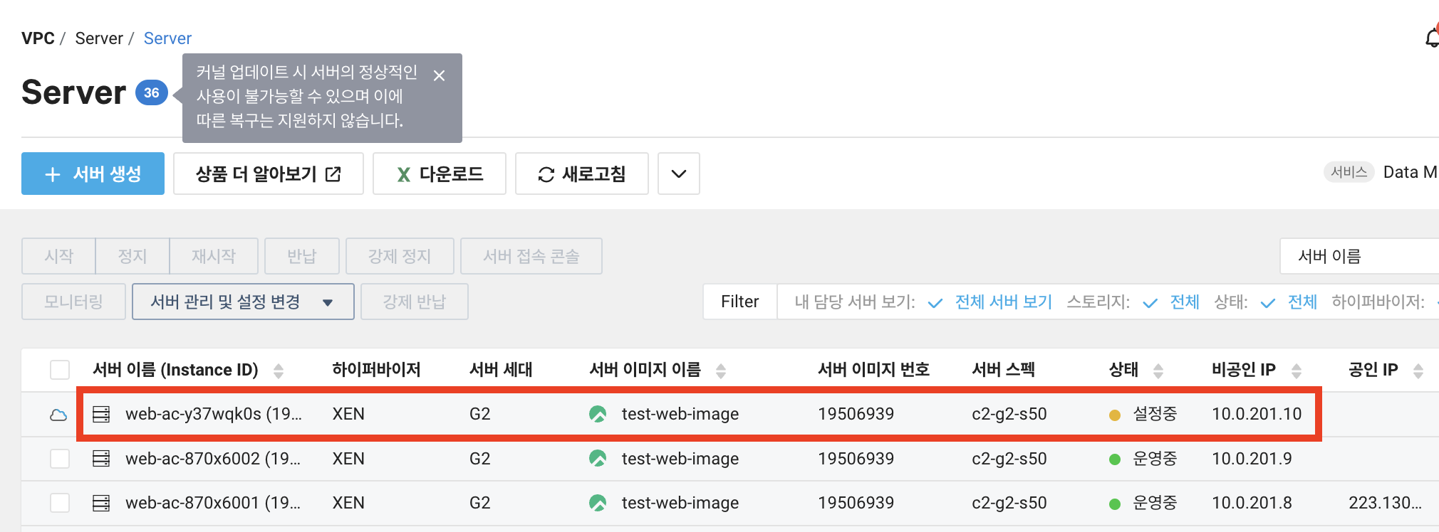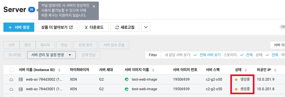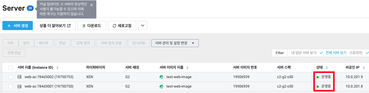 # 서버가 생성되어 상태가 ‘운영중’으로 변했더라도, 서버의 업데이트 설치 등 작업에 의해서 헬스 체크에 정상 응답하지 못하는 경우가 생길 수 있습니다.