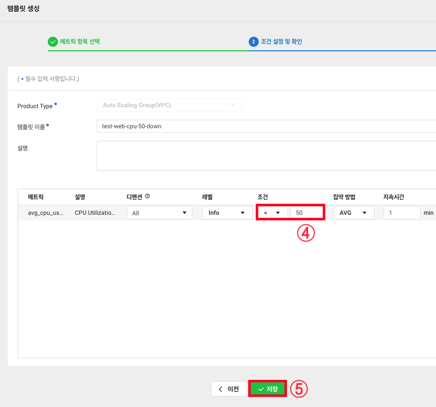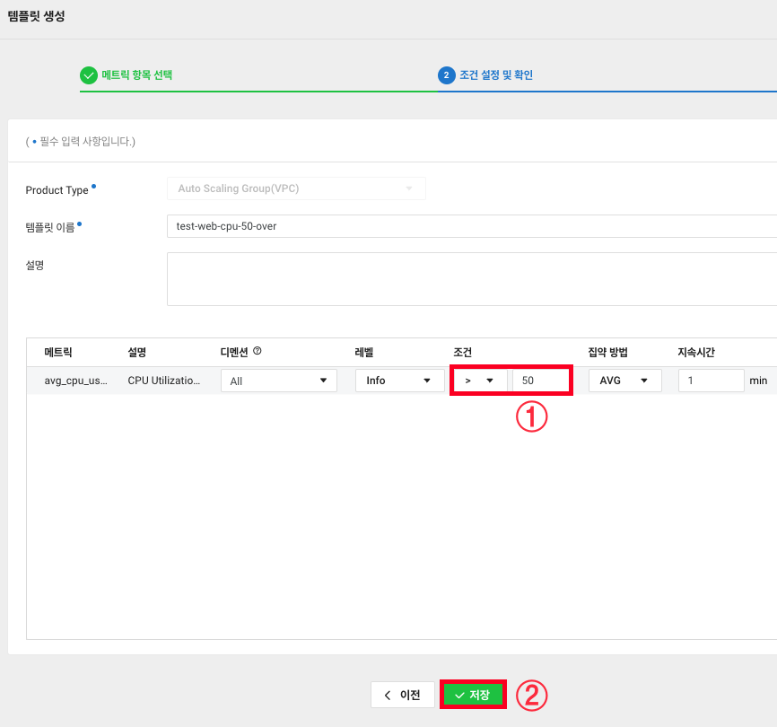 7. cpu 사용률 50% 초과와 미만, 2개의 템플릿을 만들어야 합니다. 우선 초과에 대한 템플릿을 생성하겠습니다.