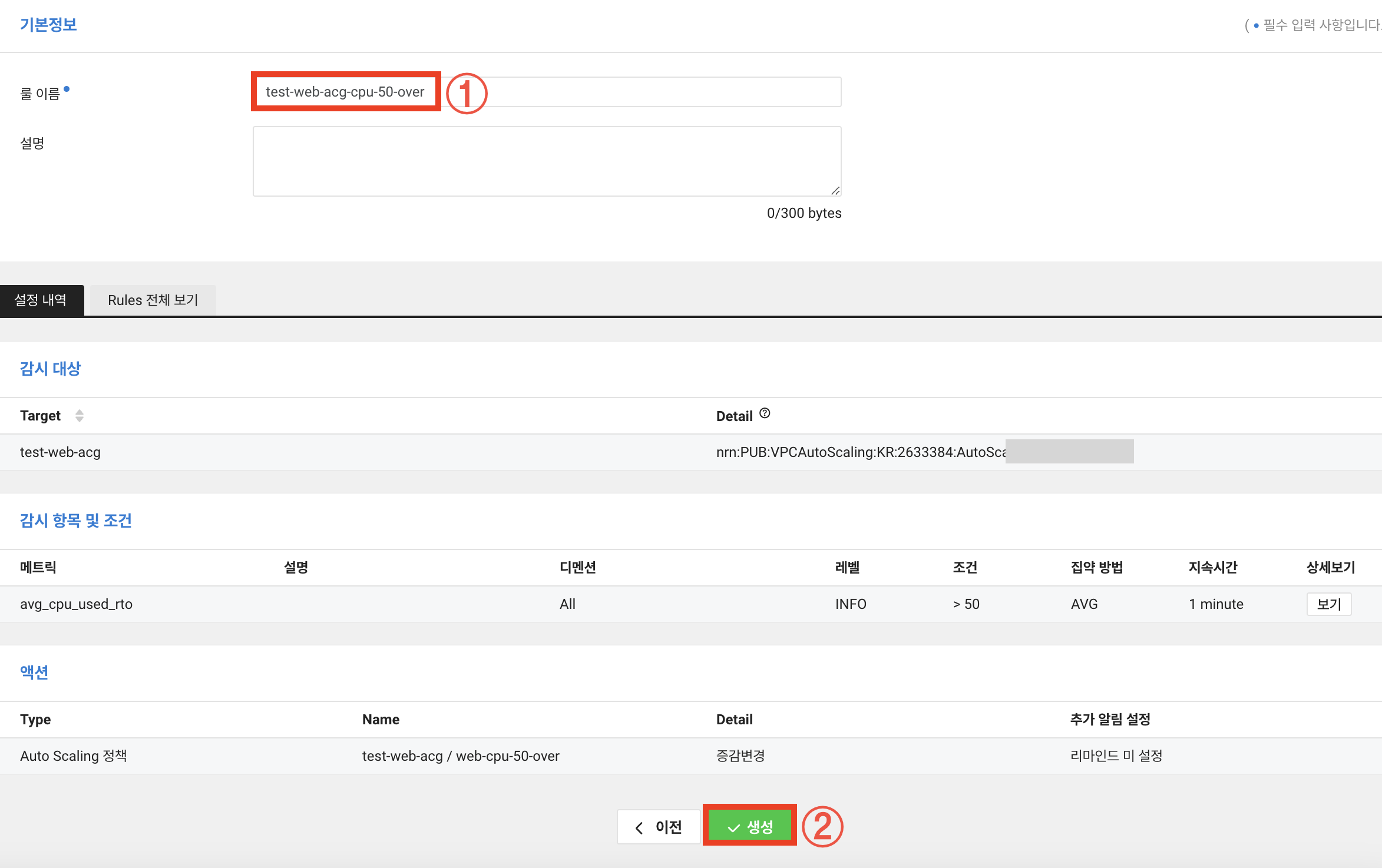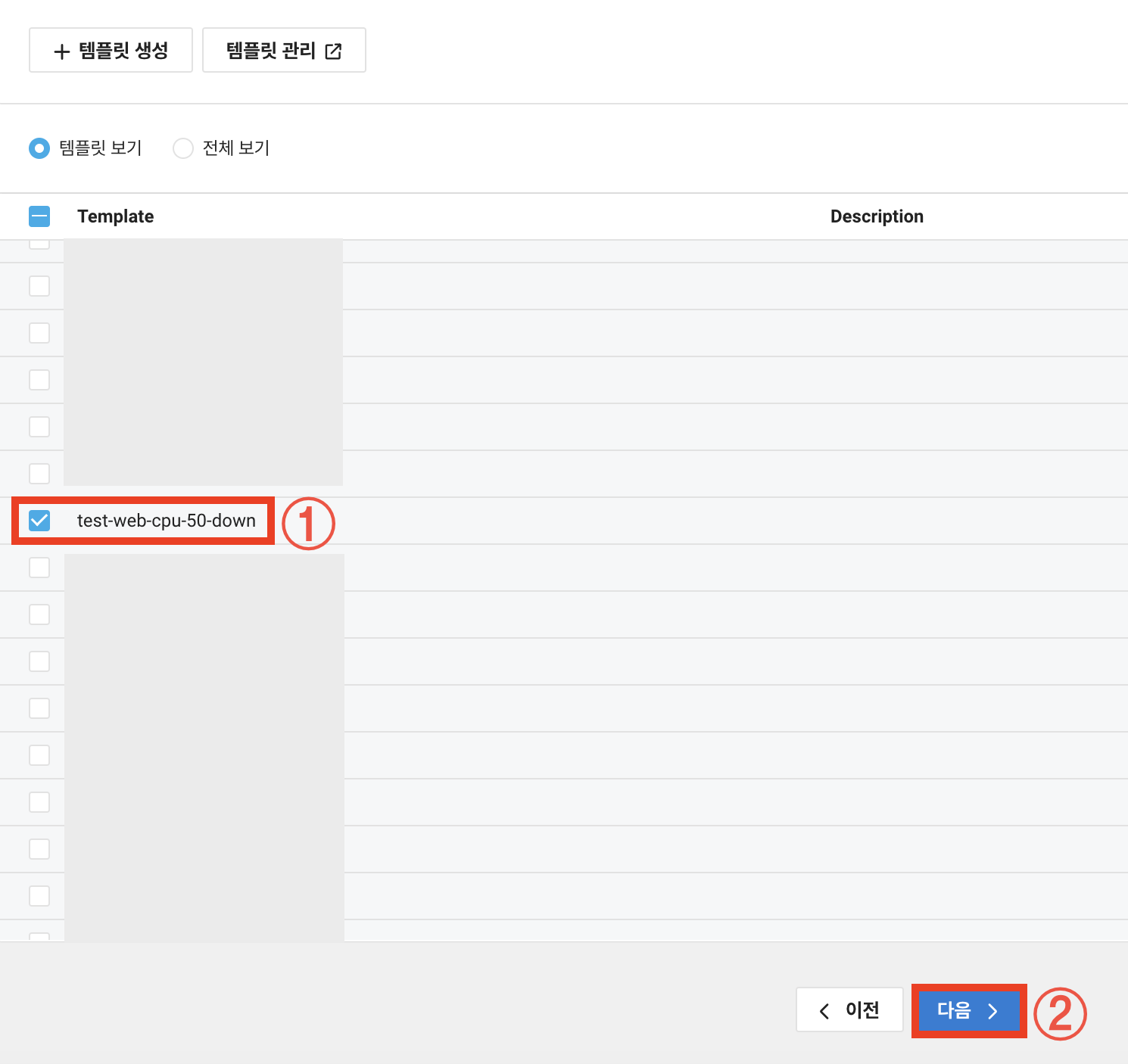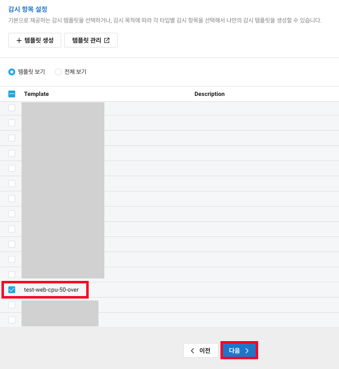 현재 선택한 템플릿은 CPU 사용률 50%를 넘었을 시 였으니 web-cpu-50-over를 선택하겠습니다.