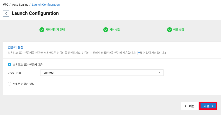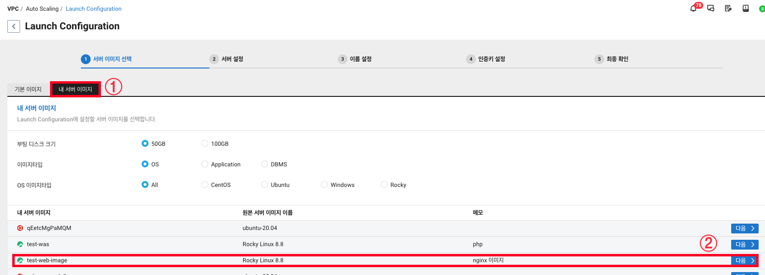 3. https://angrycloud.tistory.com/33에서는 Auto Scaling 서비스를 생성하지 않아서 Auto Scaling Group(VPC) 카테고리가 없었지만 지금은 Auto Scaling을 생성했기 때문에 카테고리가 생겼습니다. 선택 후 다음을 클릭합니다.
