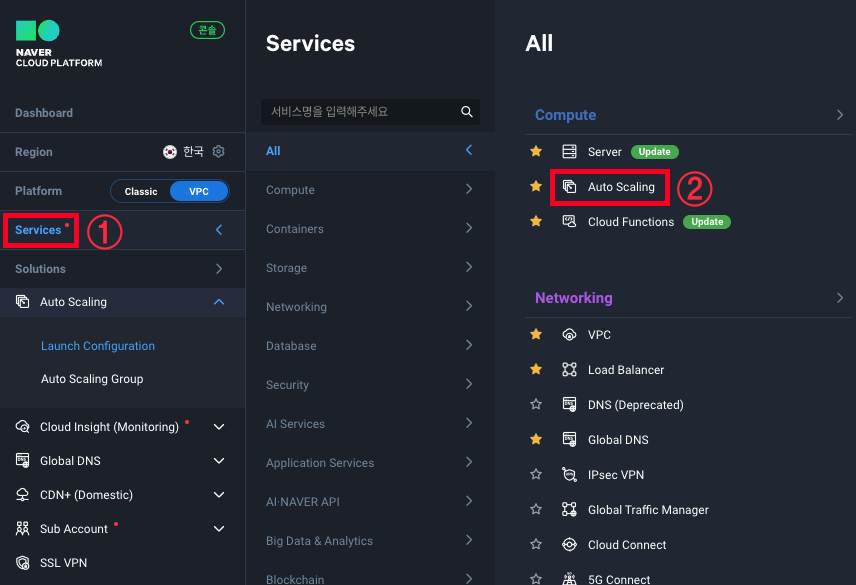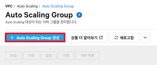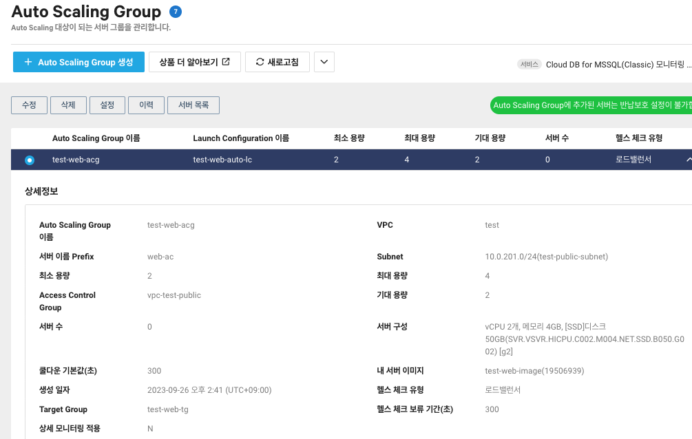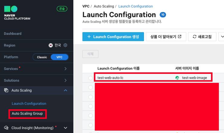 test-web 그룹은 Server(VPC) 카테고리에서 생성했기 때문입니다. 현재 보이는 그룹들은 Auto Scaling Group(VPC)에서 생성한 그룹들이기에 마찬가지로 Server(VPC) 카테고리에서는 보이지 않습습니다.