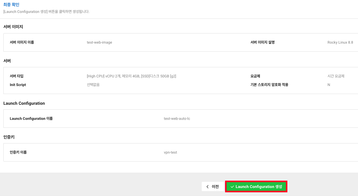 7. 이 Launch Configuration로 생성될 서버의 설정들을 확인하고 Launch Configuration 생성을 클릭합니다.