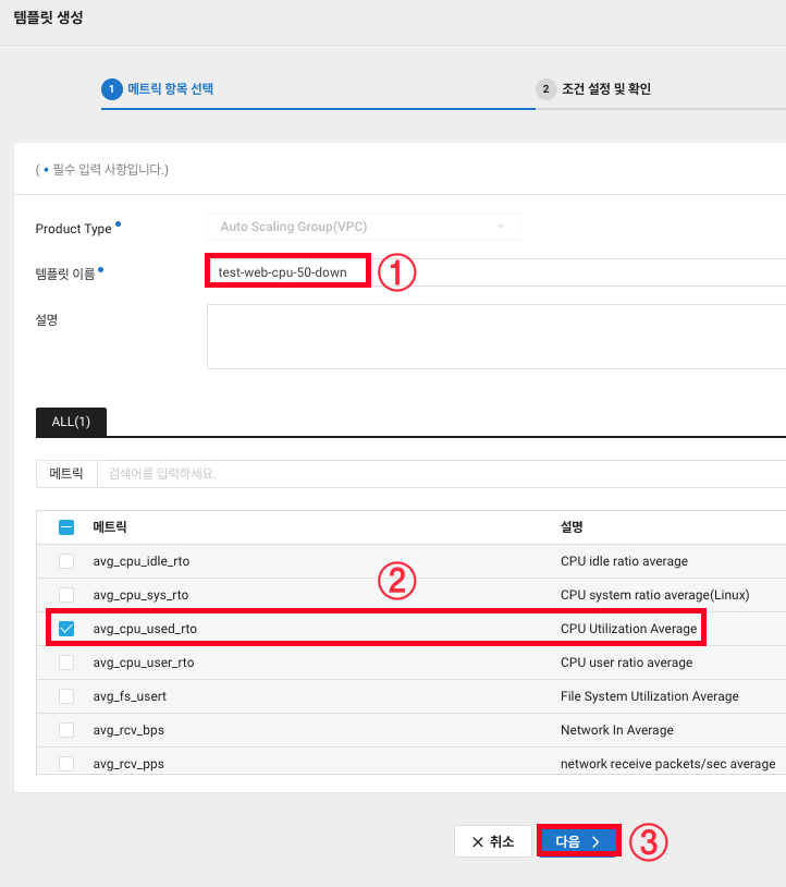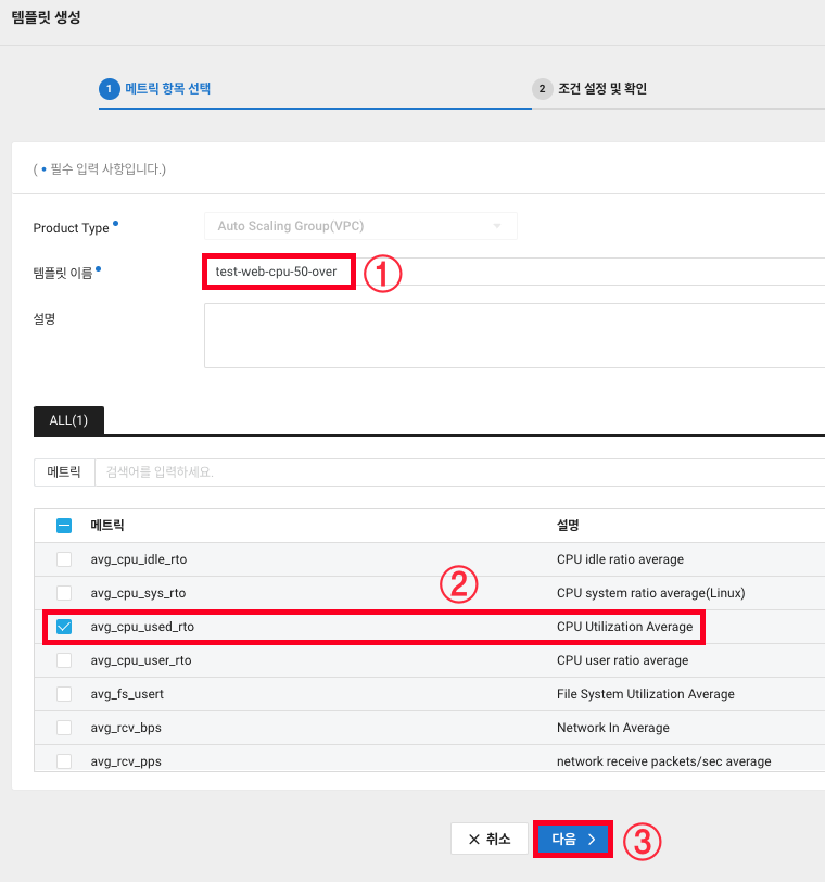 이름을 적어주고 메트릭은 avg_cpu_used_rto을 선택, 다음을 클릭합니다.