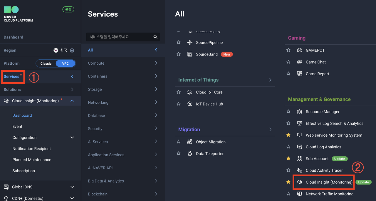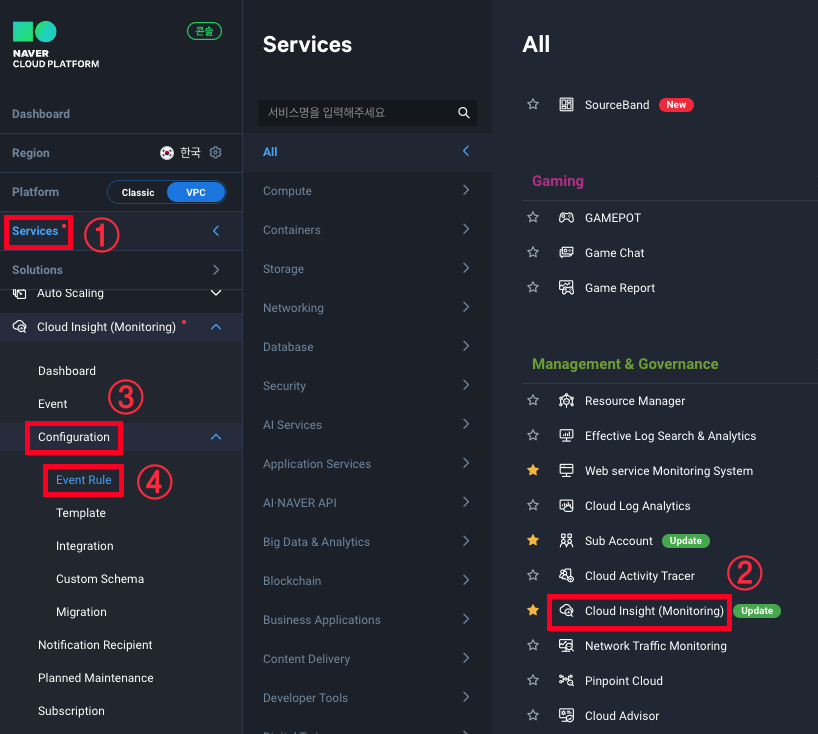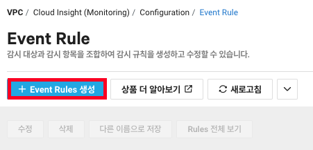 1. Service -> Management & Governance -> Cloud Insight -> Configuration -> Event Rule을 클릭합니다.