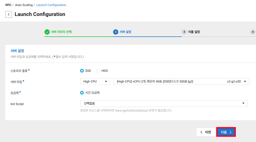 스토리지는 SSD를 사용하고 서버 타입이나 사양도 그대로 사용하겠습니다.