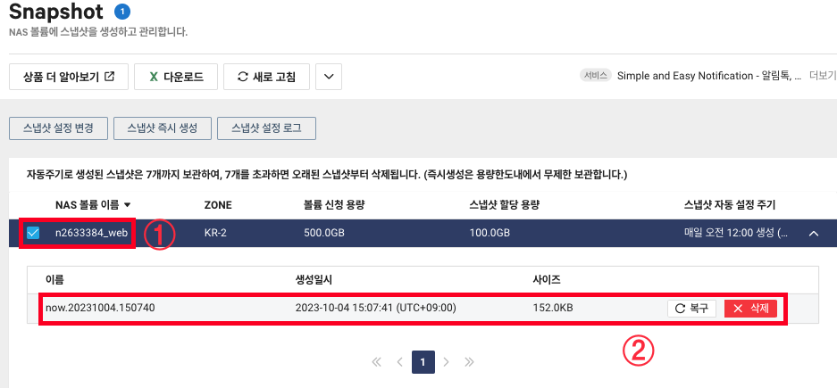 생성 주기에 따라 자동 생성된 스냅샷은 7개까지 보관되며, 7개 초과 시 오래된 스냅샷부터 삭제됩니다.